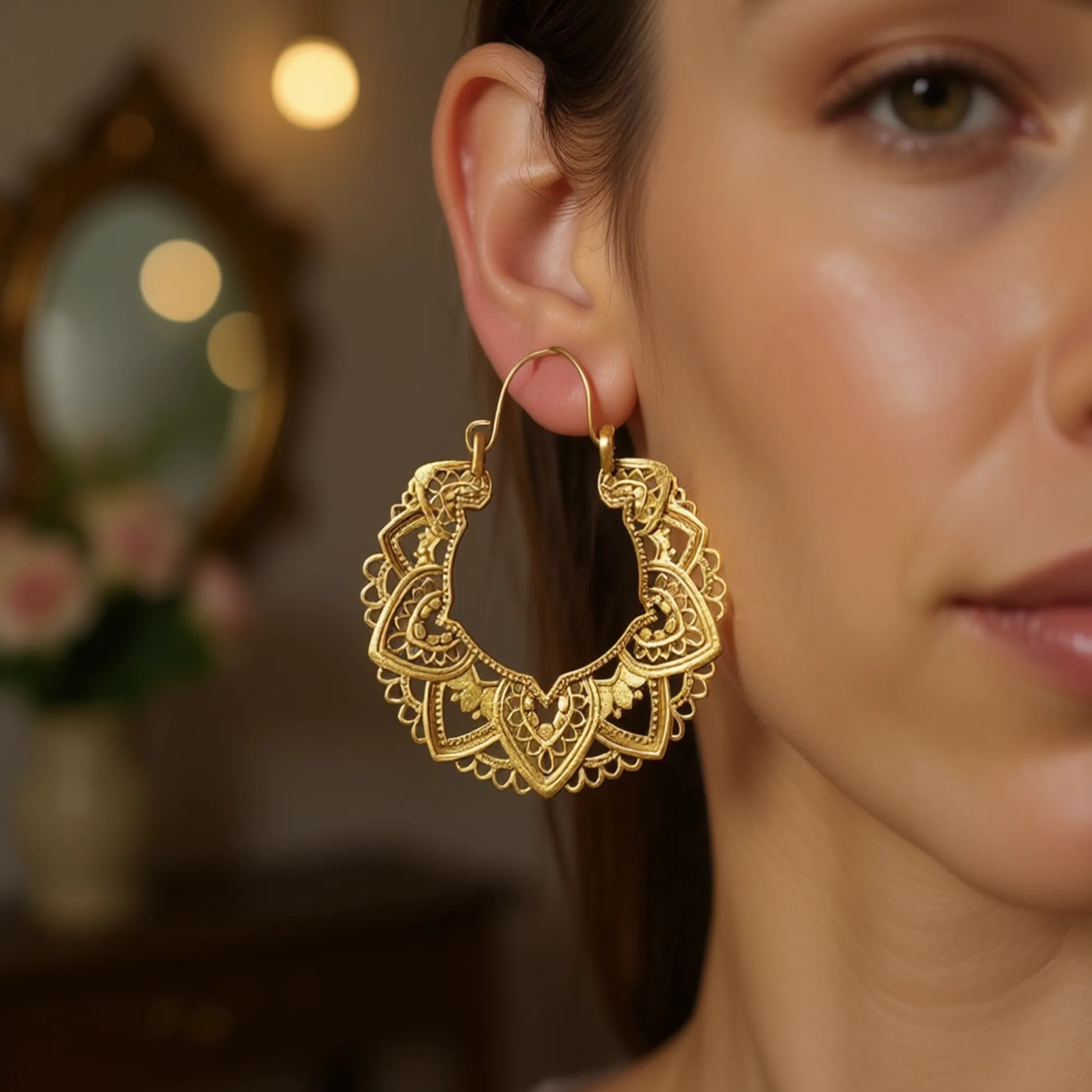 Product Introduction: Elevate your style with the E3733 Golden Hoop Earrings, a stunning piece of Bohemia-inspired fashion jewelry crafted for women who appreciate intricate design and timeless elegance. These earrings feature a delicate yet bold open hoop structure adorned with detailed filigree patterns, offering a perfect blend of vintage charm and modern flair. Ideal for adding a touch of glamour to any outfit, they are especially suited for parties, evening events, or casual occasions where a statement accessory is desired. Core Features: Reasons to Purchase: