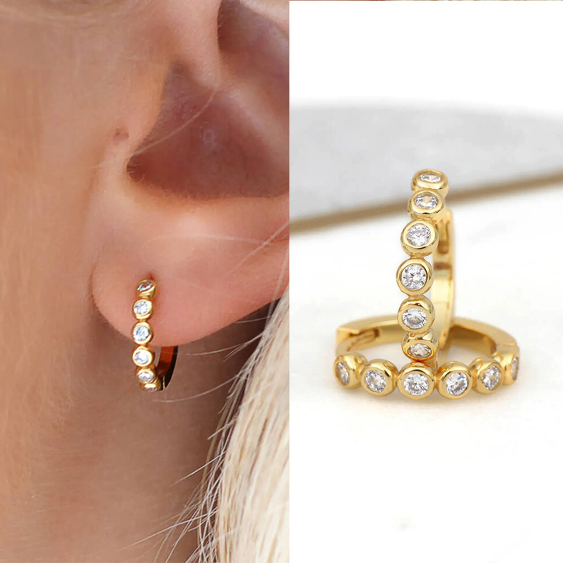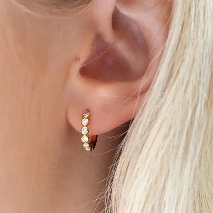 Color Gold materialtype metal diamondshape Round Brilliant Cut shape\pattern Other earringstype Huggie Earrings occasion Party inlaytechnology Bezel Setting gender Women's mainstone Crystal, Rhinestone jewelrytype Earrings jewelrymainmaterial Alloy plating Gold Plated style Trendy
