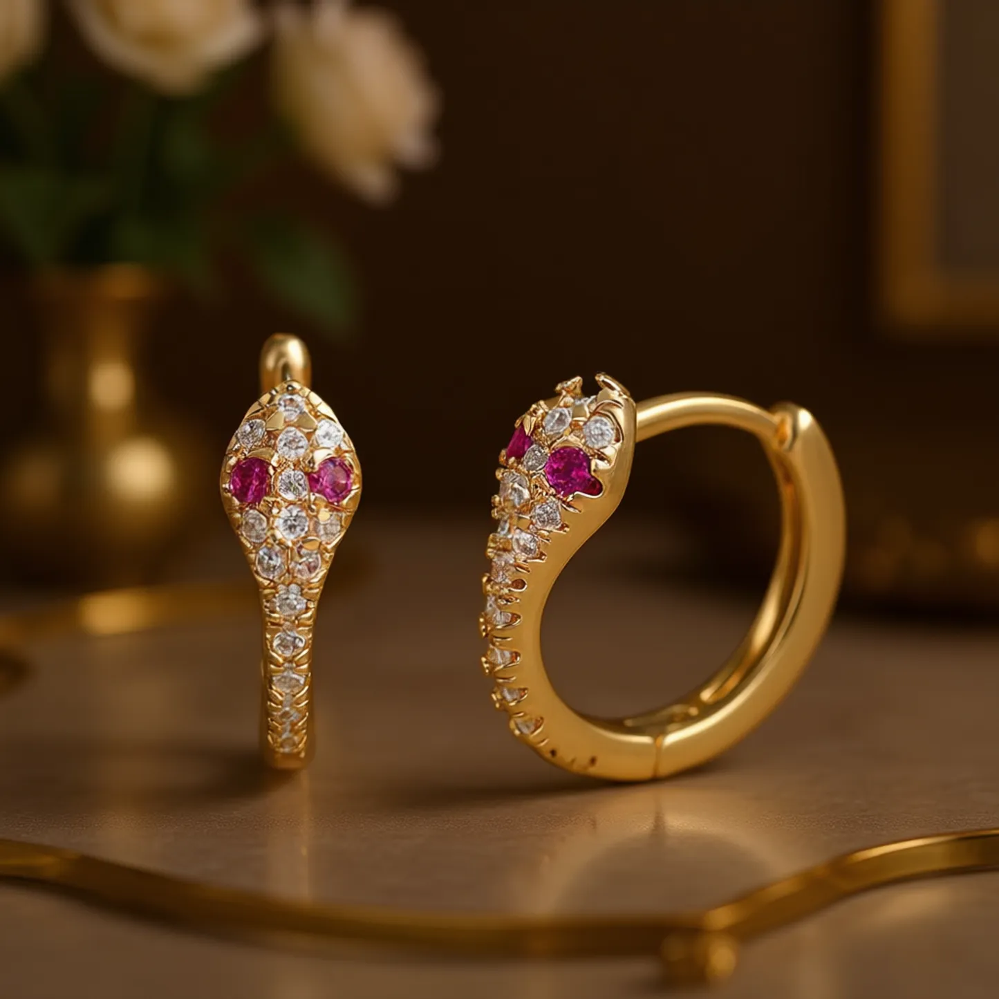 Golden Snake Hoop Earrings with Ruby and Diamond Prong Setting – Vintage Women's Party Fashion Jewelry