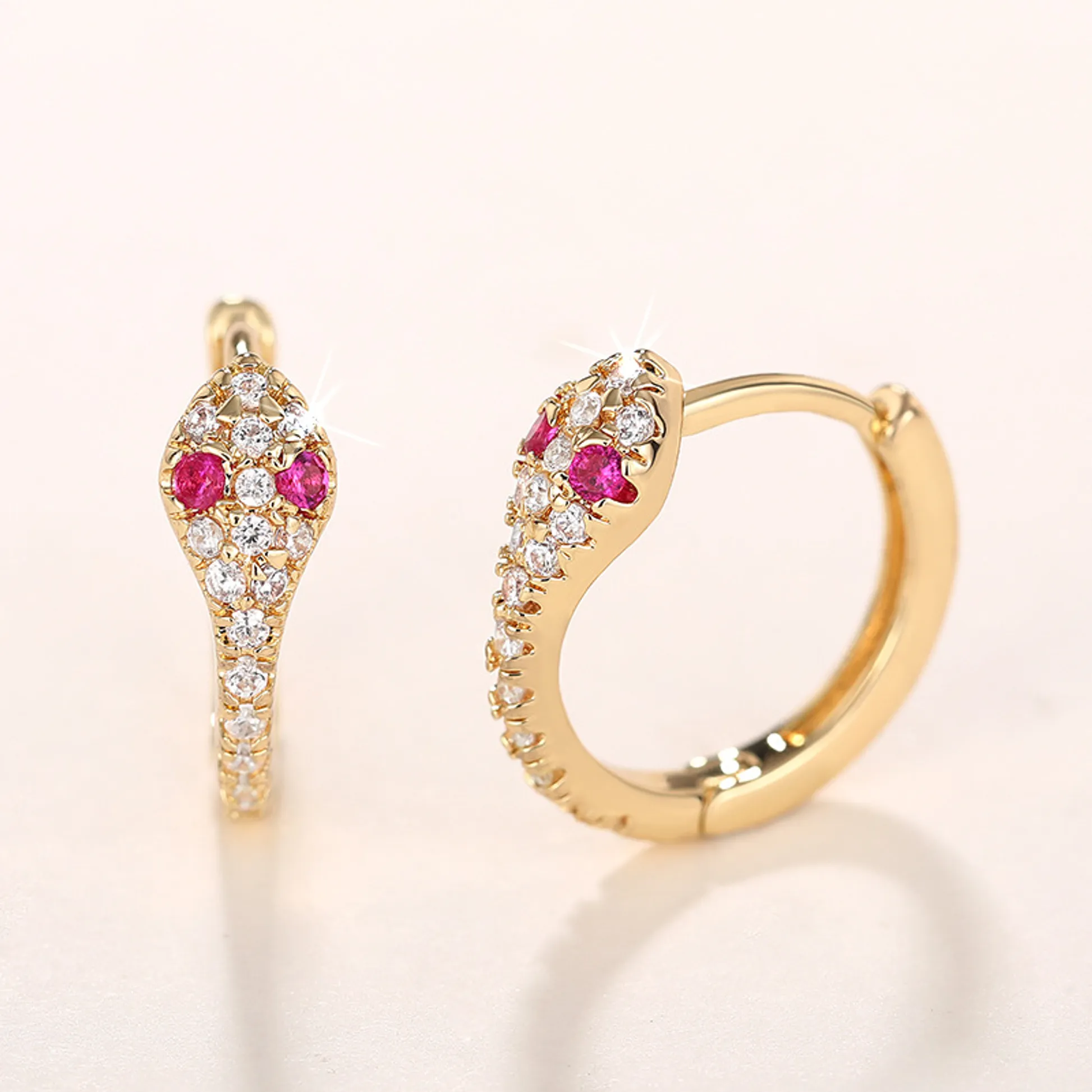 Product Introduction: These elegant Golden Snake Hoop Earrings showcase a captivating vintage design, perfectly blending timeless charm with modern sophistication. Crafted from high-quality zinc alloy and finished with a luxurious18K gold plating, these earrings feature a sleek snake motif adorned with round brilliant-cut diamonds and vibrant ruby stones. The prong setting securely holds each gemstone, enhancing brilliance and ensuring long-lasting wear. Ideal for women seeking a statement piece for parties or special occasions, these earrings add a touch of glamour to any ensemble. Core Features: Reasons to Buy: