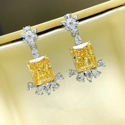 Color Yellow diamondshape Cushion Cut shape\pattern Flower earringstype Drop Earrings occasion Party inlaytechnology Claw Setting materialtype Zinc Alloy gender Women's mainstone Diamond jewelrytype Earrings jewelrymainmaterial Alloy style Classic