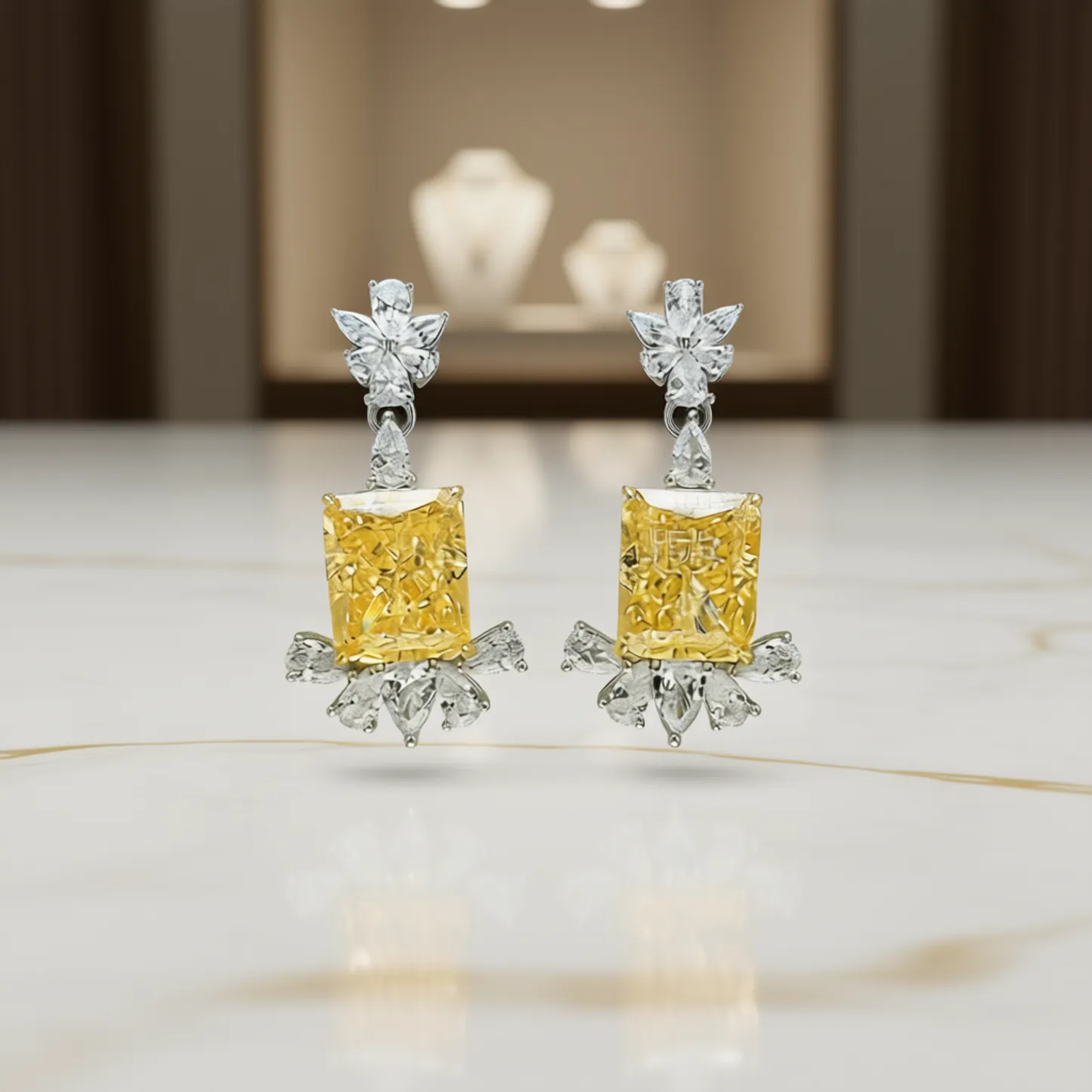 Product Introduction: Elevate your elegance with these exquisite Flower Shape Yellow Diamond Drop Earrings, designed to capture attention at any formal occasion. Crafted with a classic aesthetic, these earrings feature a stunning cushion-cut yellow diamond as the centerpiece, surrounded by delicate floral accents made of sparkling clear stones. The elegant drop design adds movement and grace, making them a perfect choice for parties, weddings, or evening events. Core Features: Why Choose These Earrings: Flower Shape Yellow Diamond Drop Earrings for Women – Classic Party Jewelry