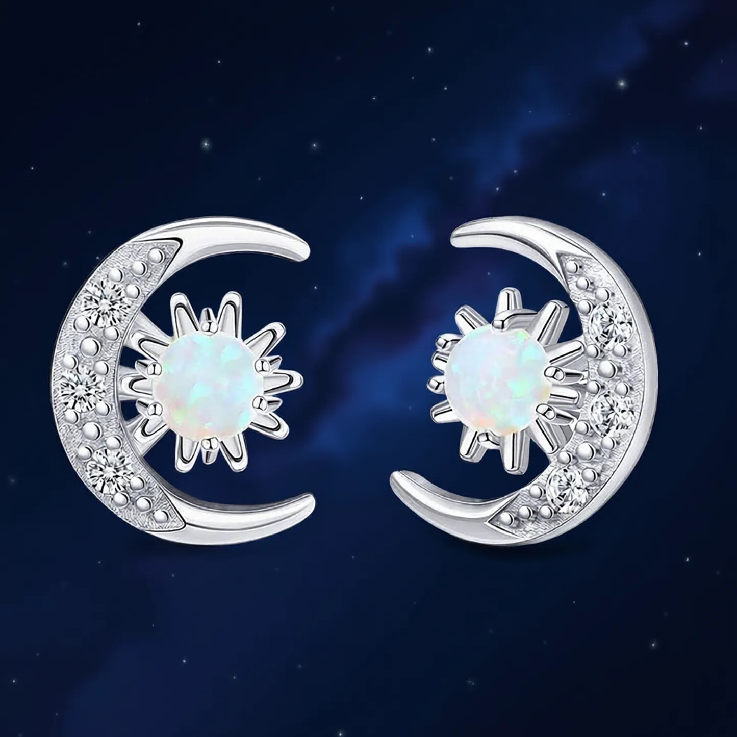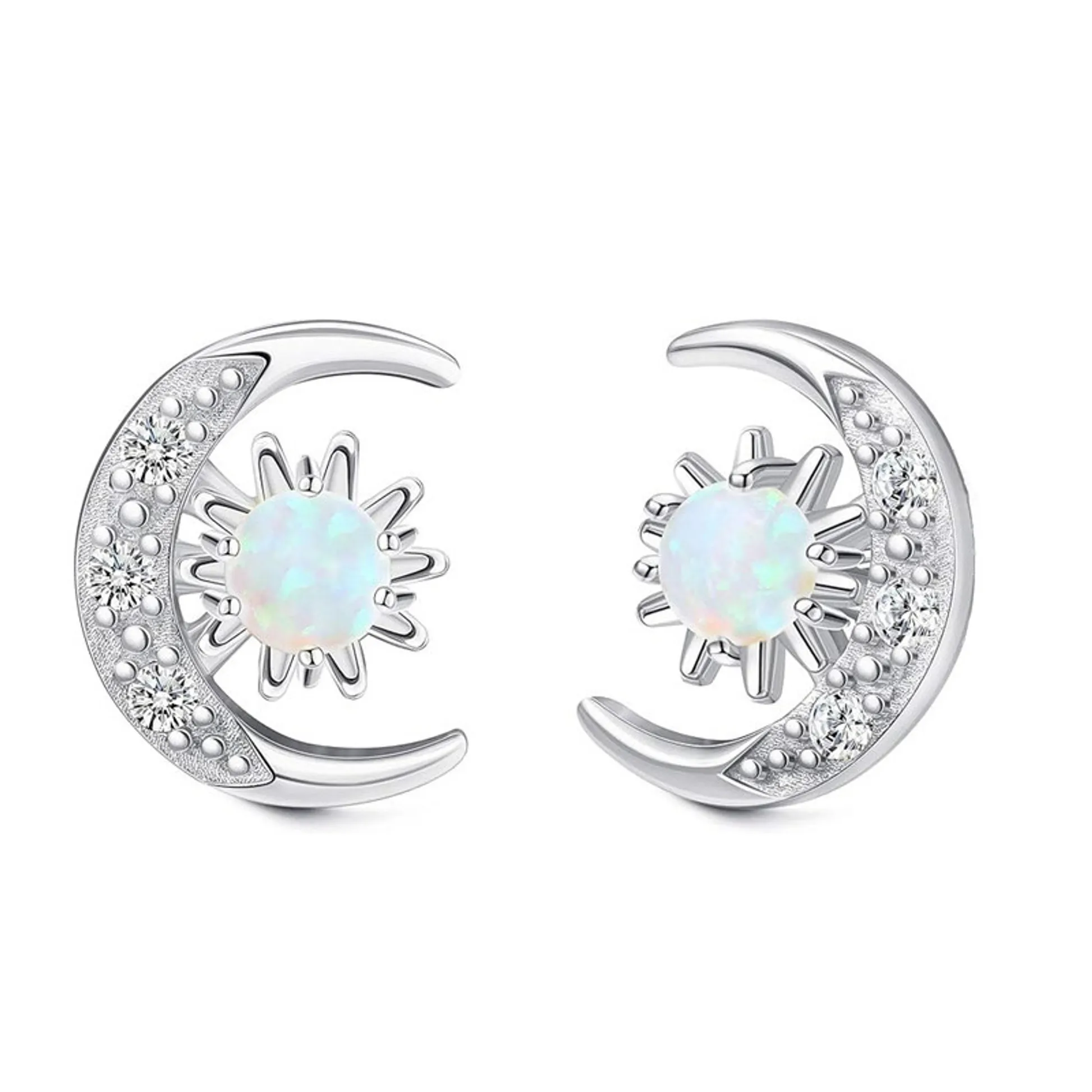 Silver Plated Moon Stud Earrings with Opal Stone – Romantic Women's Fashion Jewelry Gift