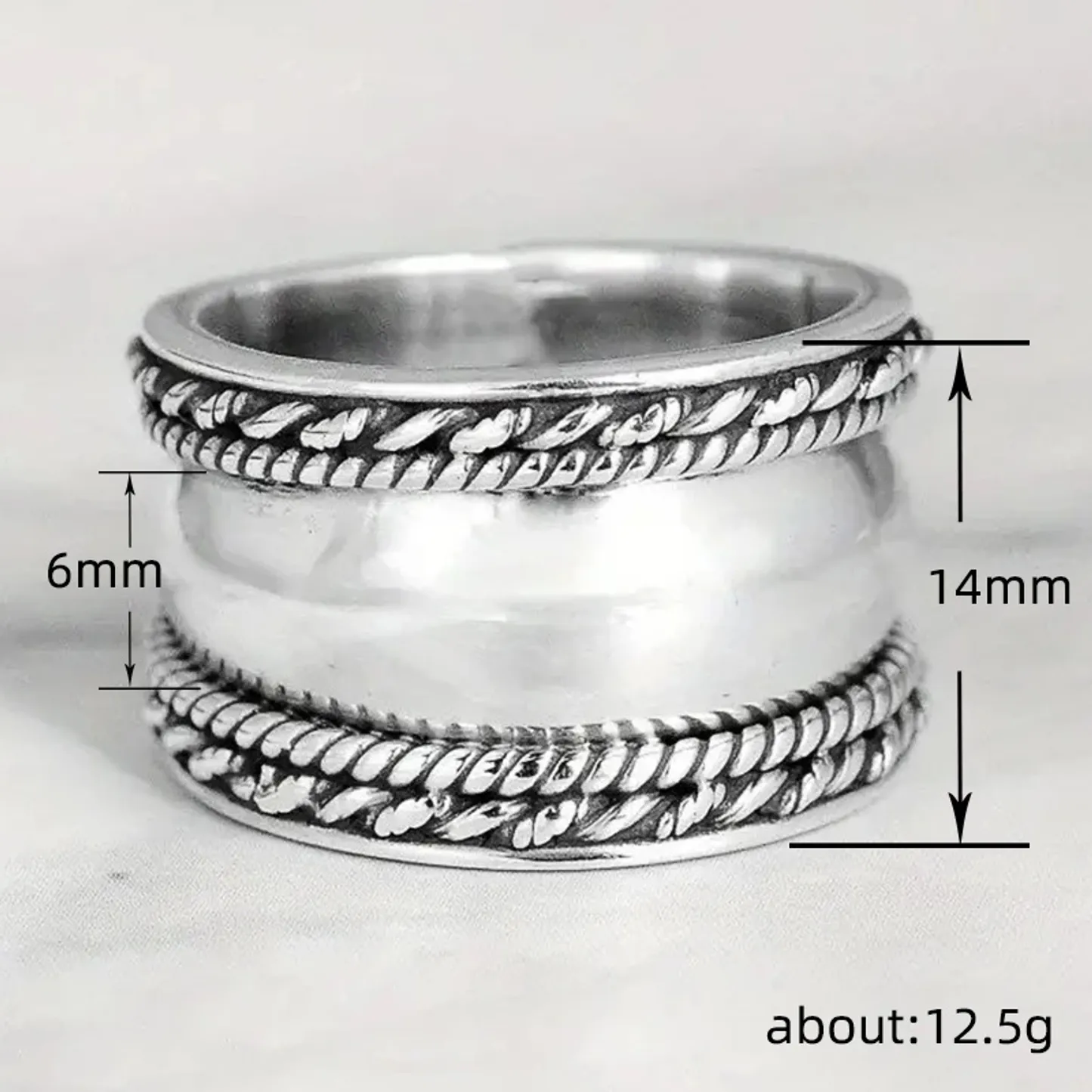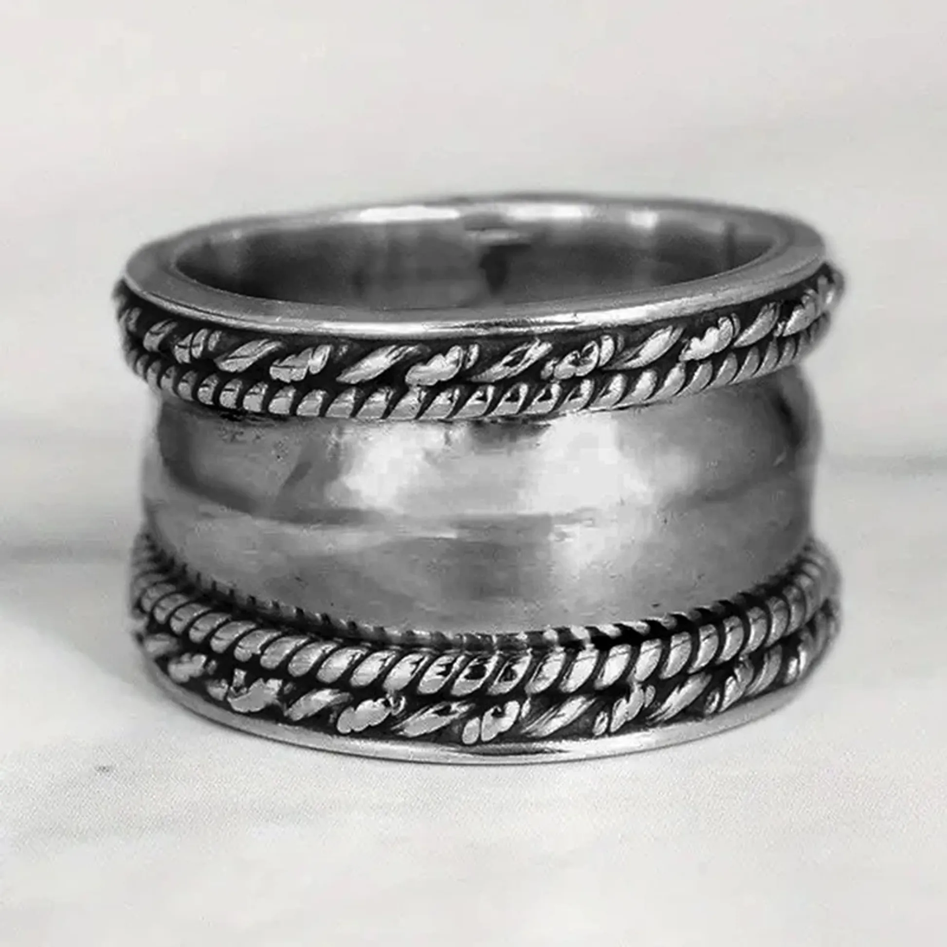 Product Introduction: This H348 ring features a sophisticated and timeless design, crafted from high-quality silver material. The ring showcases a smooth central band flanked by two intricately textured rope-style edges, creating a balanced and refined aesthetic. Ideal for those who appreciate minimalist yet detailed jewelry, this piece is suitable for daily wear or special occasions. Core Features: Why Choose This Product:H348 - Elegant Silver Ring with Rope Design