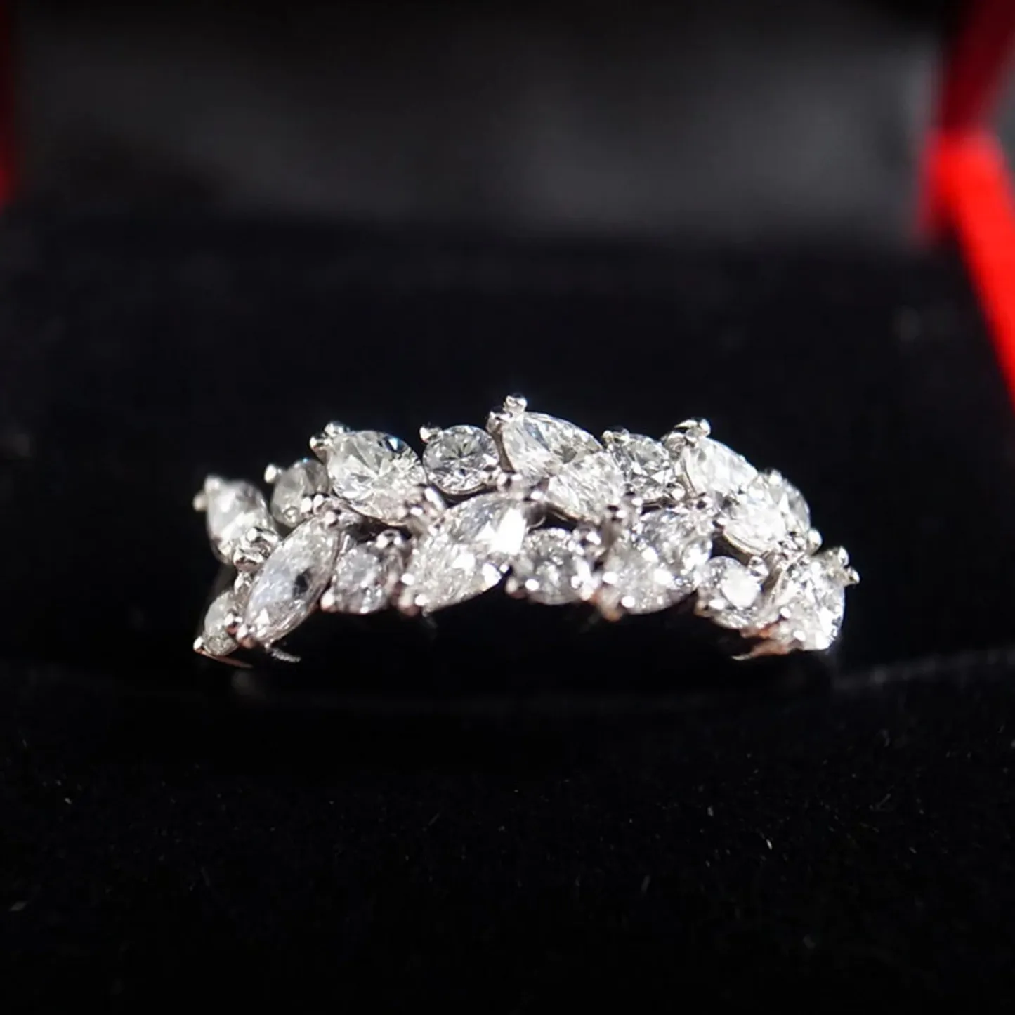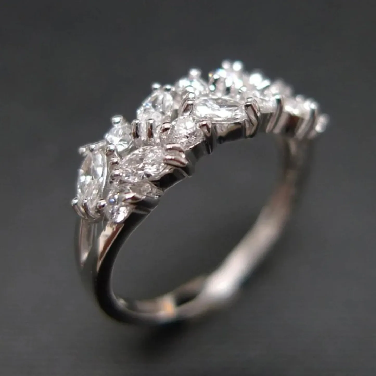 Product Introduction: This elegant Q286 ring features a sophisticated design with a series of pear-shaped and round-cut gemstones set in a sleek, polished metal band. The arrangement of stones creates a graceful, flowing silhouette that enhances the brilliance and sparkle of each stone, making it a refined choice for formal occasions or as a statement piece. Core Features: Reasons to Purchase: